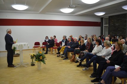 Zum Abschluss seiner Ansprache bedankte sich Hallerbach bei den Mitgliedern des Netzwerkes für die geleistete Arbeit und bat alle, ihr wichtiges Engagement auch in Zukunft fortzusetzen. Im nächsten Programmpunkt gaben die Steuerungsgruppenmitglieder Michaele Günter und Catrina Schneider einen Rückblick auf 10 Jahre Palliativnetzwerk Neuwied. Sie hoben hier besonders die jährlich stattfindenden Fachtage und die bis zu fünf Mal im Jahr organisierten Qualitätszirkel hervor. Die Qualitätszirkel starteten 2008 als Fortbildungen für Ärztinnen und Ärzte, wurden aber schnell für alle Professionen, die sich in der Palliativ- und Hospizarbeit engagieren, geöffnet. Den Höhepunkt der Festveranstaltung bildete der Vortrag von Dr. Elke Freudenberg, Psychoonkologin vom Herz-Jesu-Krankenhaus in Dernbach, mit dem Thema „In Gleichklang … mit den An- und Zugehörigen?“ In Form eines Ein-Personen-Stücks schilderte sie sehr berührend und eindrucksvoll die Gefühlswelt einer Angehörigen, die die Krebsdiagnose ihres Ehemannes und die Leidenszeit bis zum Tod im Hospiz verarbeiten musste. Wichtig dabei war ihr zu vermitteln, dass vor der letzten Lebensphase eines Menschen, seinem Leiden und Sterben, ein „ganzes Leben“ mit individuellen Höhen und Tiefen lag, das den betreuenden, pflegenden und beratenden professionellen Mitarbeiterinnen und Mitarbeiter meistens verborgen bleibt.